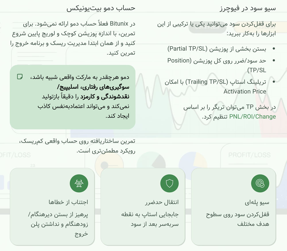 در Bitunix فعلاً حساب دمو ارائه نمیشود؛ اگر نیاز به تمرین دارید با اندازه پوزیشن کوچک و لوریج پایین شروع کنید و از همان ابتدا مدیریت ریسک و برنامه خروج را تمرین کنید. به خاطر داشته باشید که دمو هرچقدر به مارکت واقعی شبیه باشد، «سوگیریهای رفتاری، اسلیپیج/نقدشوندگی و کارمزد» را دقیقاً بازتولید نمیکند و میتواند اعتمادبهنفس کاذب ایجاد کند؛ بنابراین تمرین ساختاریافته روی حساب واقعی کم ریسک، رویکرد مطمئنتری است.